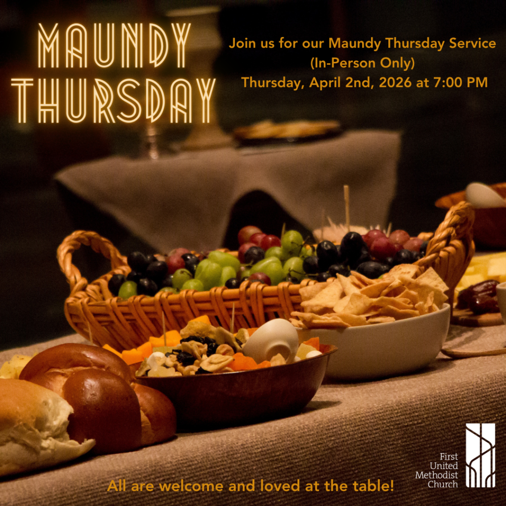 Join us for our annual Maundy Thursday Service at 7p in the Sanctuary. This service is in-person only and will not be streamed. At FUMC we break bread and share a meal like Jesus did at the Last Supper.