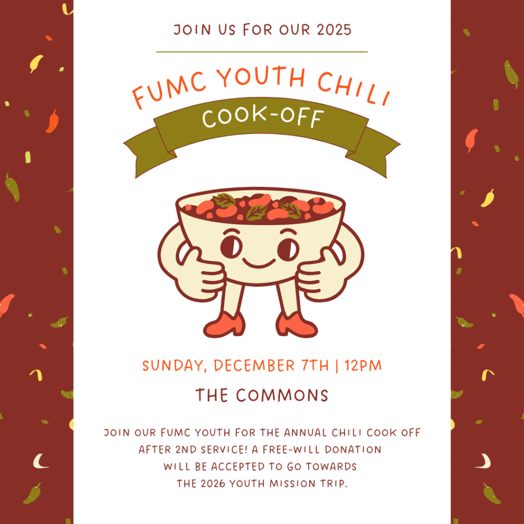 It’s Chili time! The 2025 Youth Chili cookoff fundraising event takes place on Sunday December 7th at First United Methodist Church Omaha. All proceeds will help fund the 2026 Youth summer mission trip.